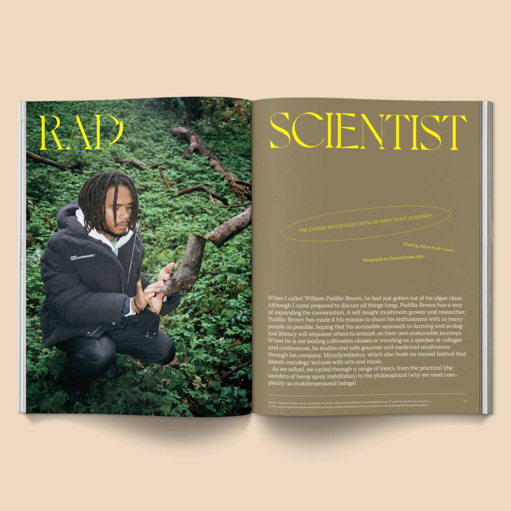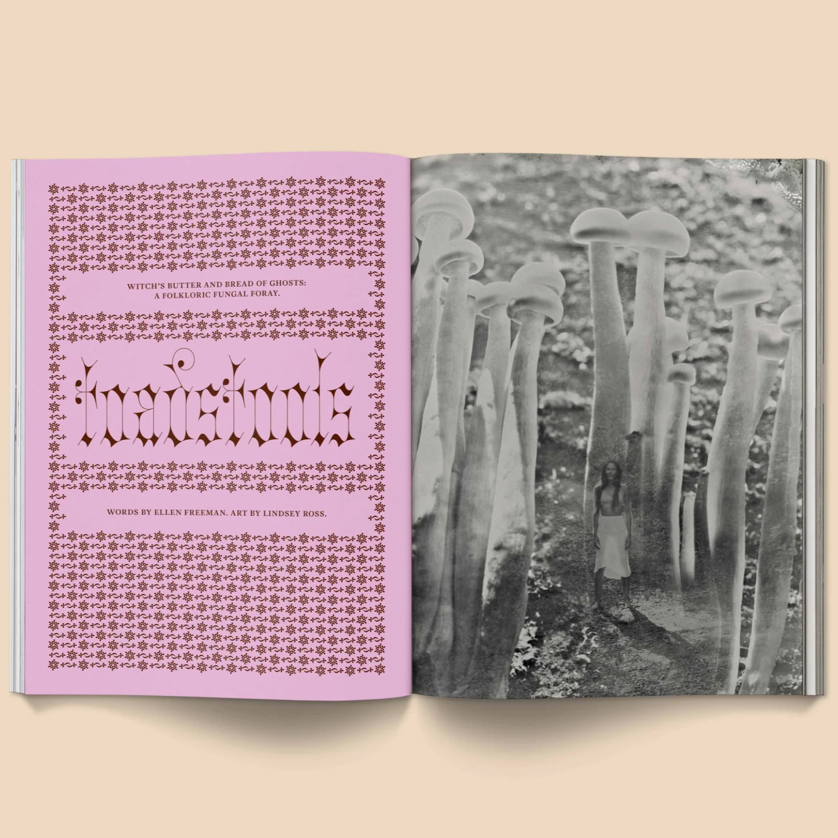 Inside Mushroom People, Bethany van Rijswijk delves into the folklore of the magic mushroom, arrangements by Leslie Kirchhoff and Yasmine Khatib prove that mushrooms are the new flowers, Claire L. Evans goes inside the trip report forum Erowid, Zoe Gong heals what ails us, Adrienne Kammerer paints a slug’s-eye-view, William Padilla-Brown talks citizen mycology, Shruti Ravindran breaks down the neuroscience of tripping, and Lio Min searches for counter-culture on the forest floor. Plus: MycoAstrology, Mushroom Fashion Week, the search for a lost perfume, hacking a chat-shroom in the Wood Wide Web, glowing mushroom lamps, Mixtec transcendental gastronomy, a mushroom burial suit, and much more.