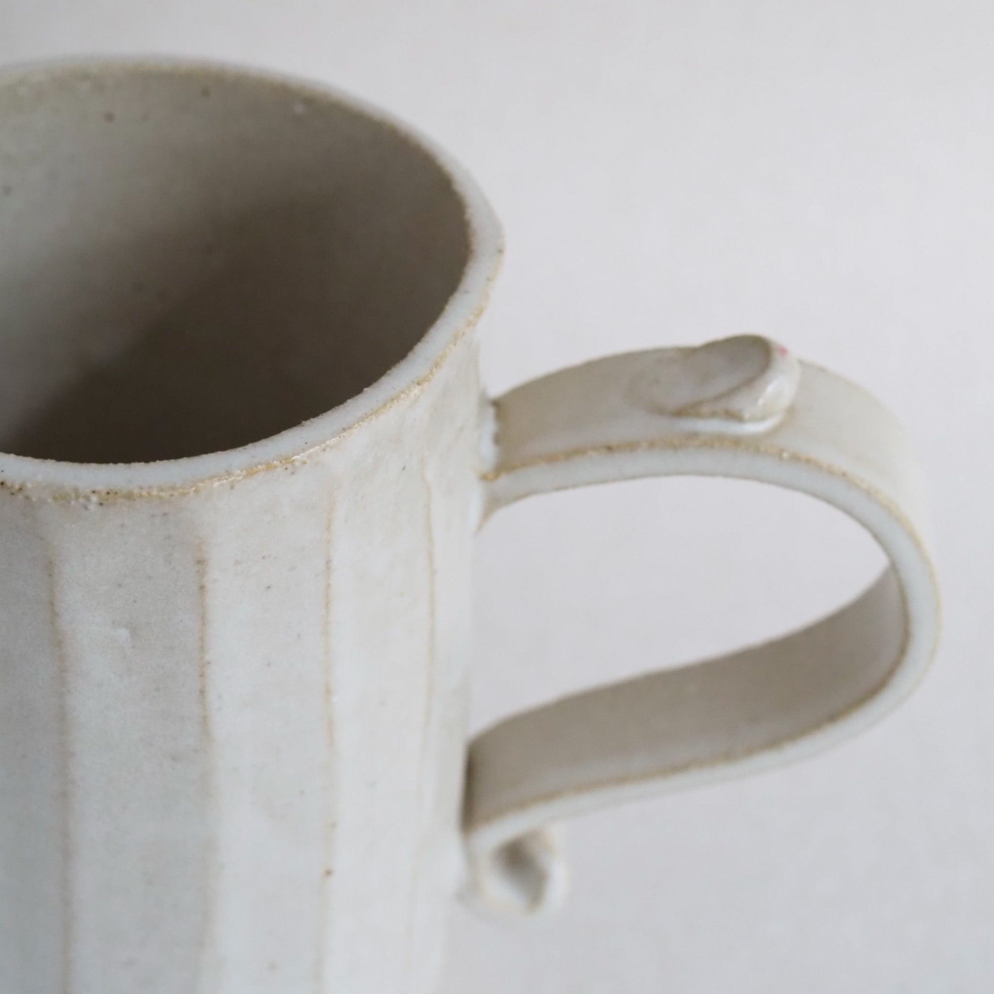 Straight-sided pitcher hand-carved ribbing and a French-inspired handle. Doubles as a vase. Handmade in Des Moines, Washington.