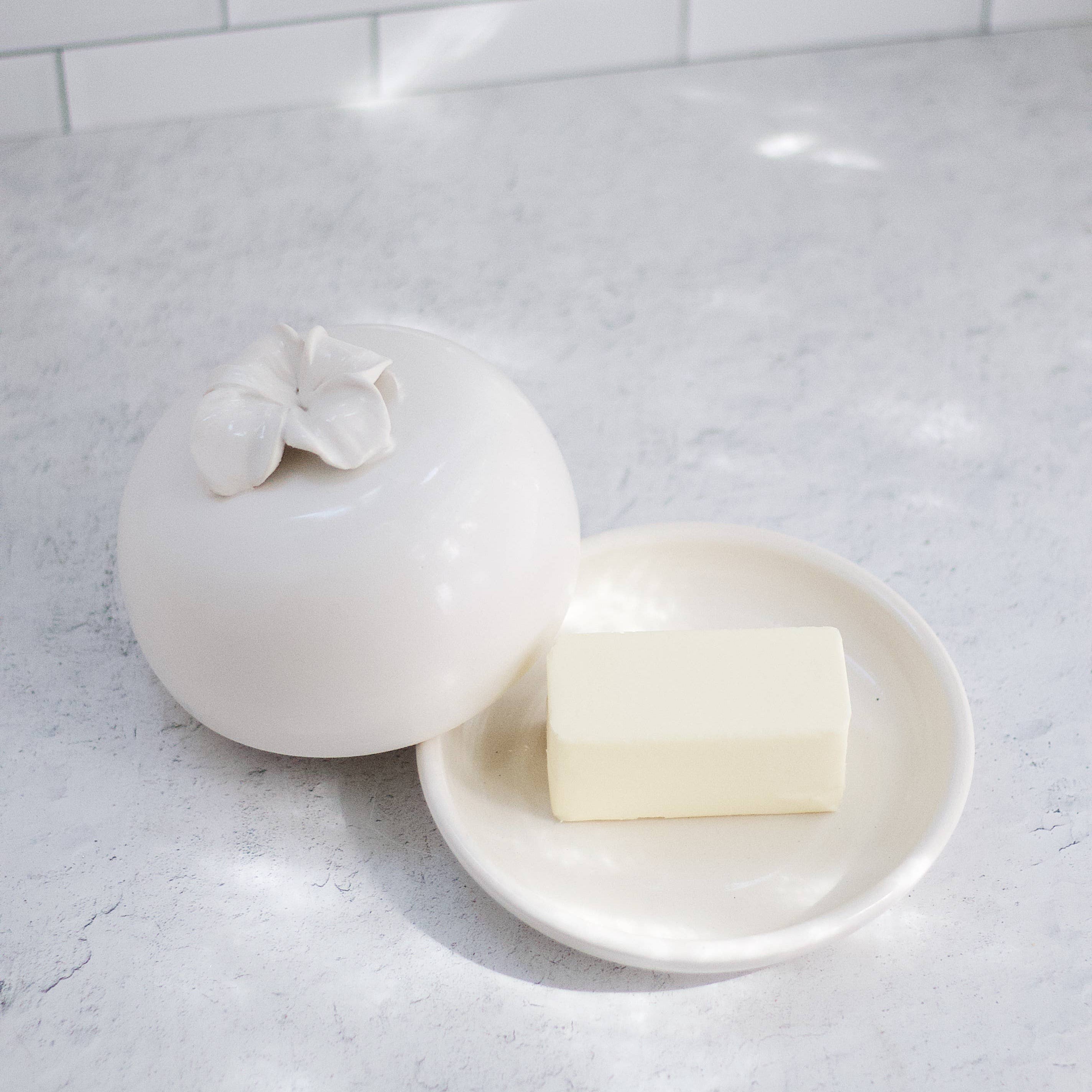 This cream-colored butter dish is the perfect addition to your kitchen. The lid fits snugly on top, keeping your butter fresh and ready to use. The butter dish is dishwasher and microwave safe. Please handle with care
