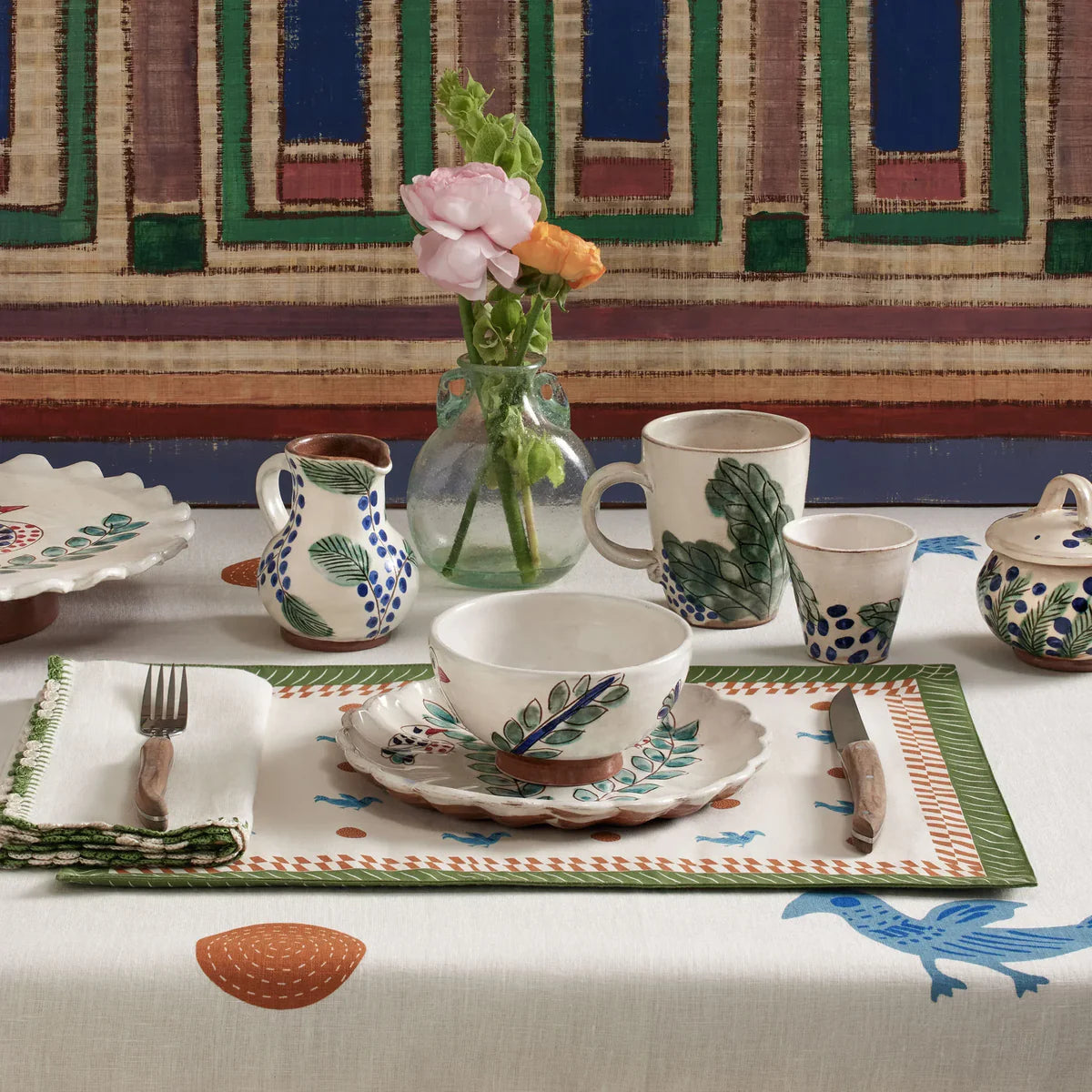 Our Dotty Vine collection features bold green fronds with bold blues playfully dotted around them. Individually hand moulded and painted by our potters in Fayoum, the beauty of each piece lies in its uniqueness. Pair this delicate Cream Jug with our matching wares of the same line for a cohesive kitchen aesthetic your neighbours will envy!